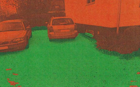 I then classify each pixel as an obstacle or ground and I applied a red or green hue to the pixel based on the classification to get an image like the one above. Conveniently the camera I used had a built in IMU that I used to determine orientation and could use to help calculate the normal of the ground plane so the fitting would work in real-time without manual adjustments.