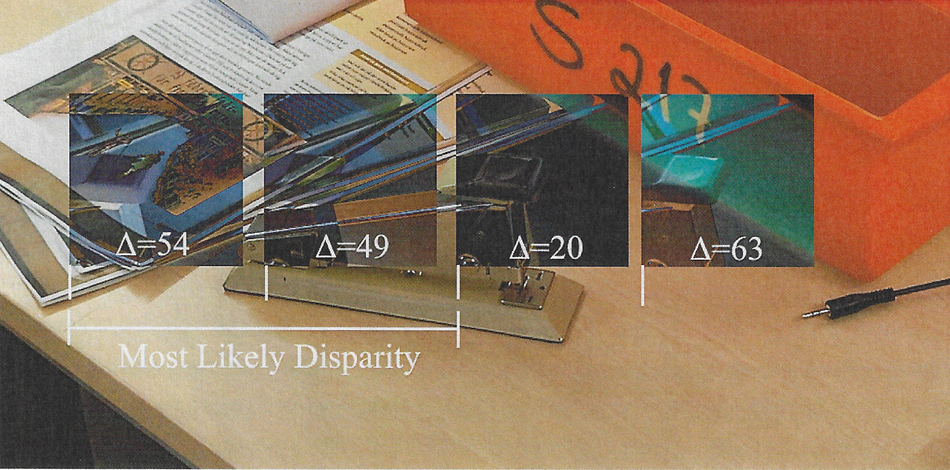 I start by introducing how stereoscopic camera feeds can be used to determine a depth buffer. This was also a bit before computer vision started getting very machine learning oriented, so it was just good old comparing 2 pictures and trying different offsets to see where there was the least disparity between the two in a small subsection of the image and then applying some filtering on the result.