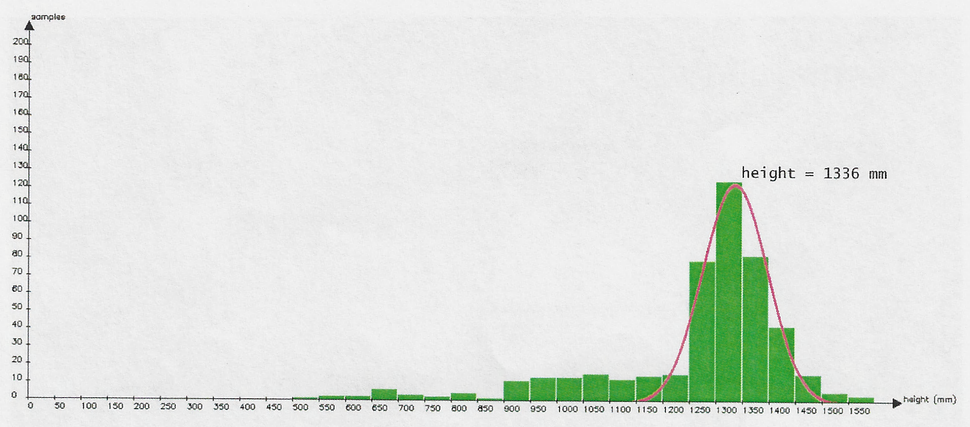 Then I get into how to determine the height of the ground, so that I later can classify things above and below ground level to be obstacles. I start by stepping from the right towards the left which in the case of this graph is from below ground and upwards. Once I find the the peak I grab the samples close to the peak to do a Gaussian distribution curve fitted to those samples. The center of the curve is used as the ground height with some margin for error.